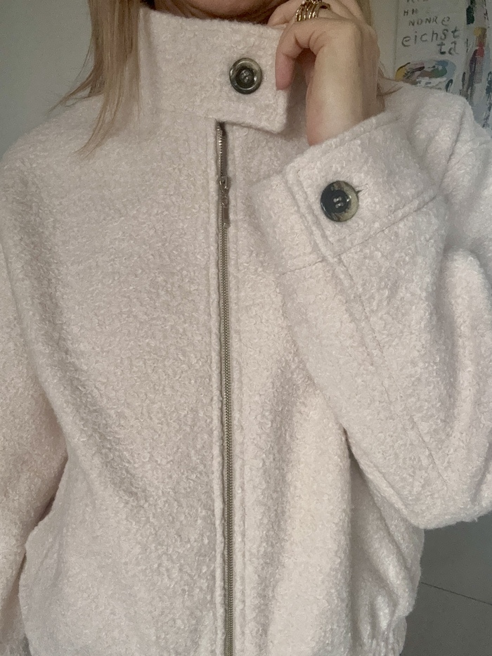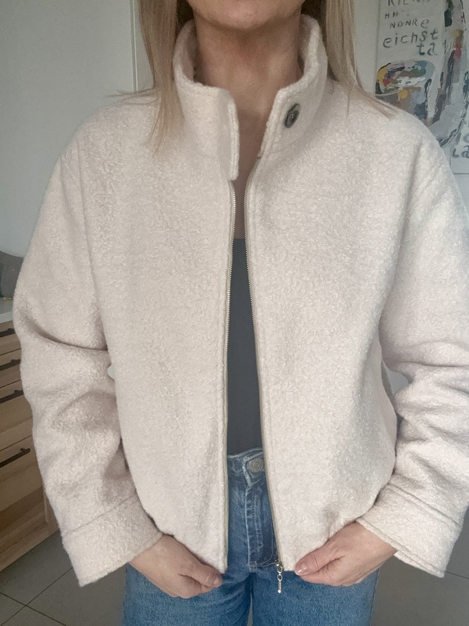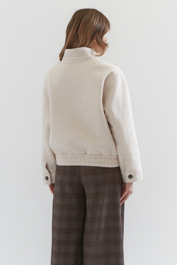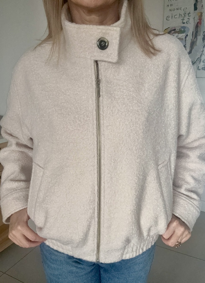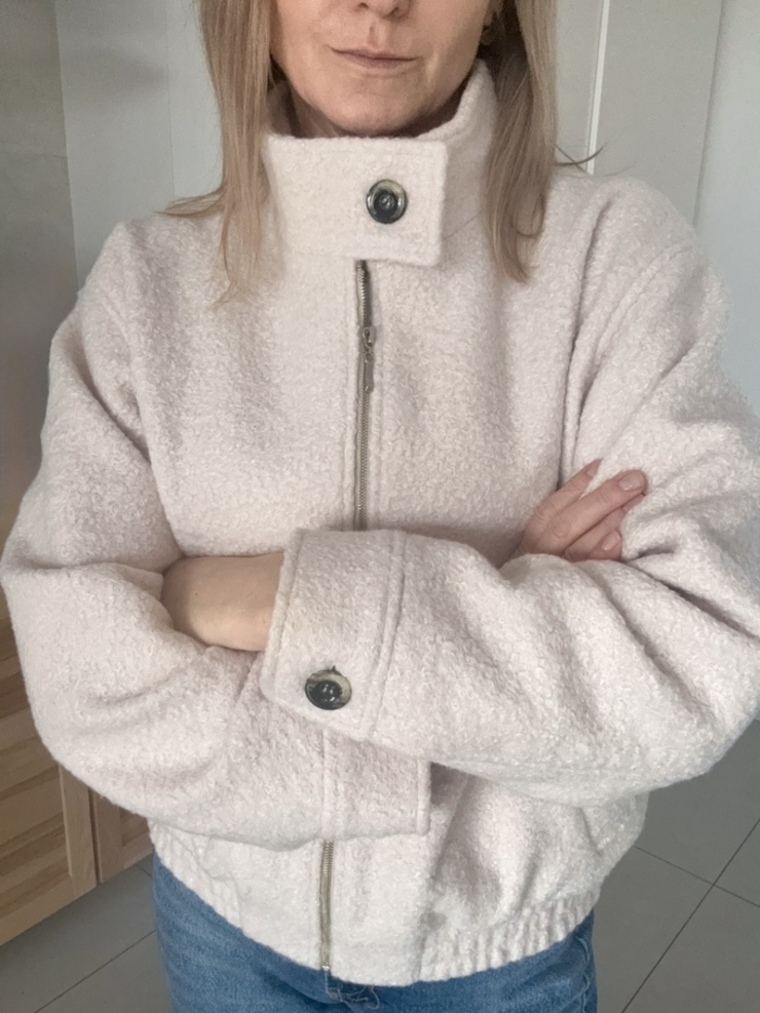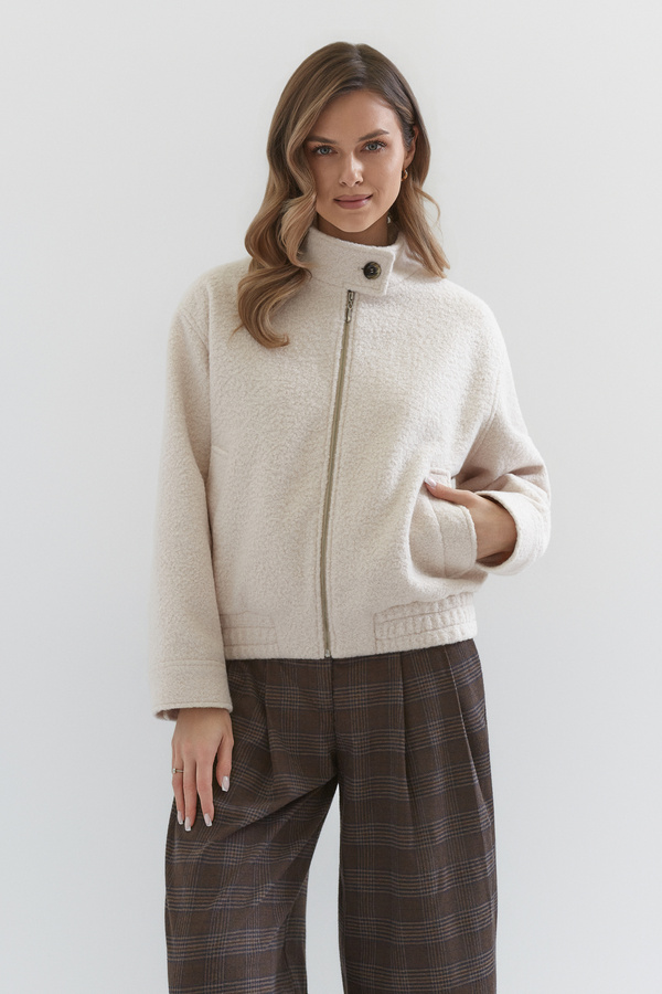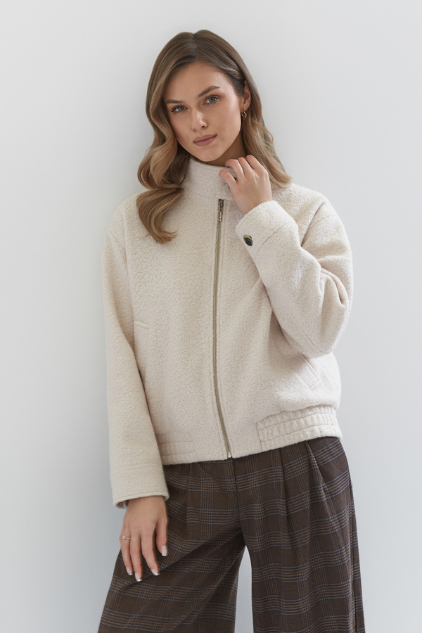 Wykonana z dbałością o każdy detal, łączy w sobie wygodę sportowej kurtki, która sprawdzi się na wiosenno-jesienną pogodę. Zapinana na suwak, wygodne kieszenie, wyższa stójka zapinana na guzik. Wykonana z tkaniny z domieszką wełny w niezwykle rozświetlającym kolorze śmietankowym.