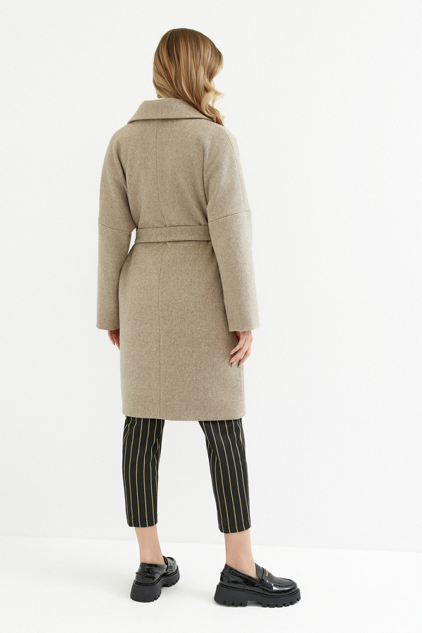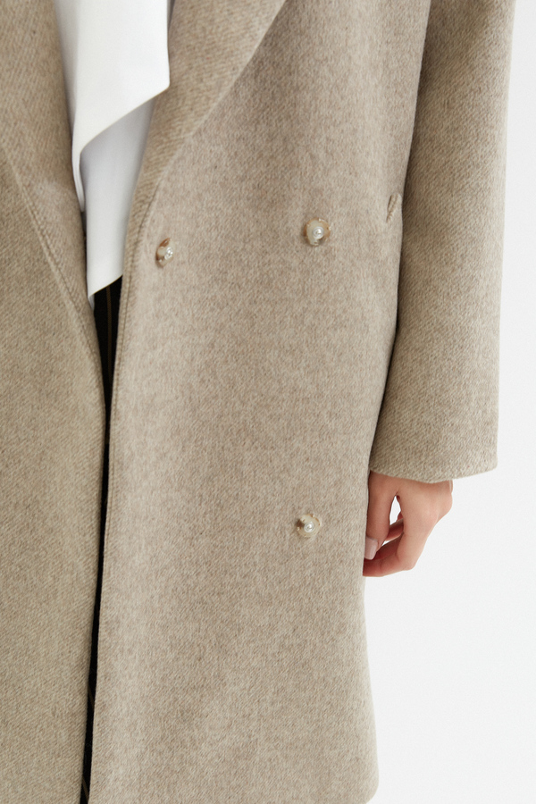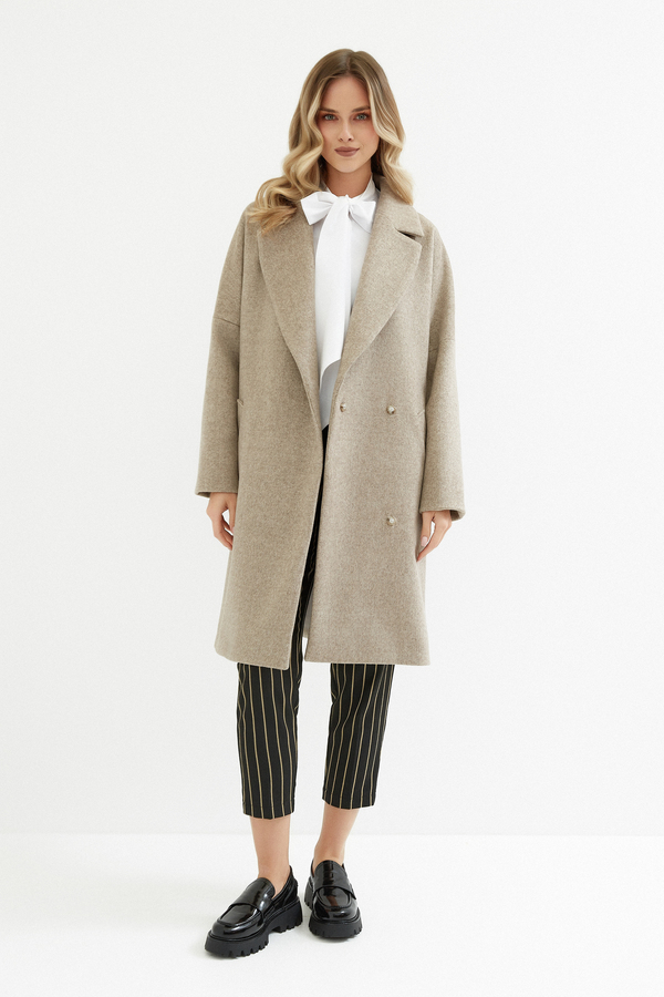 Beżowy płaszcz wełniany o dwurzędowym kroju zapinany na niewidoczne zatrzaski to propozycja dla kobiet, które poszukują klasyki w nowoczesnym wydaniu. Wełniana naturalna tkanina otula ciepłem, a jednocześnie prezentuje się wyjątkowo elegancko. Wykończony opalizującą wiskozową elegancką podszewką. Długość płaszcza do kolan wysmukla sylwetkę i prezentuje się elegancko. Subtelne klapy podkreślają ponadczasowy charakter płaszcza. Płaszcz posiada wygodne kieszenie i oddzielny pasek, co daje możliwość dwóch stylizacji: luźna bez paska, bardziej przy ciele z paskiem. Dłuższe obłożenie przy mankiecie daje możliwość wywinięcia rękawa, by dostosować długość pod siebie. To model, który świetnie odnajdzie się zarówno w zestawieniu z elegancką sukienką, jak i w duecie z jeansami i botkami na co dzień. Uniwersalna kolorystyka i klasyczny fason to niezbędny element jesienno-zimowej garderoby.